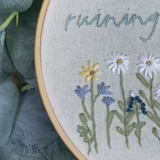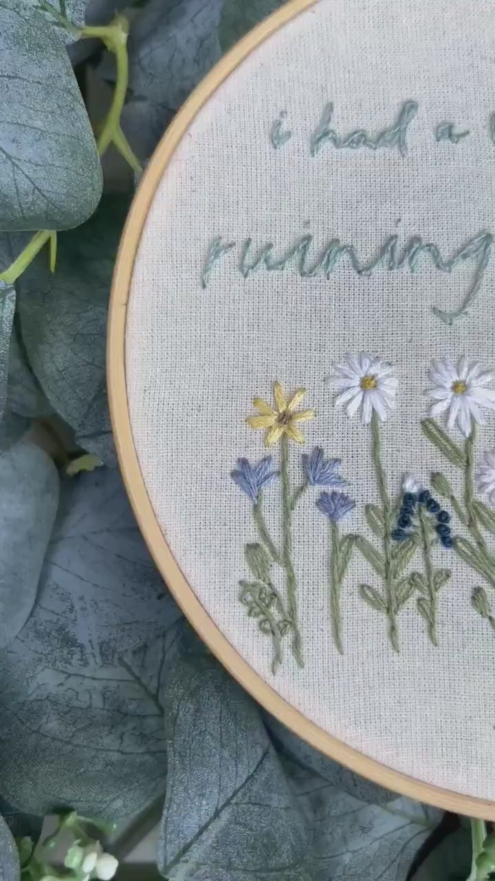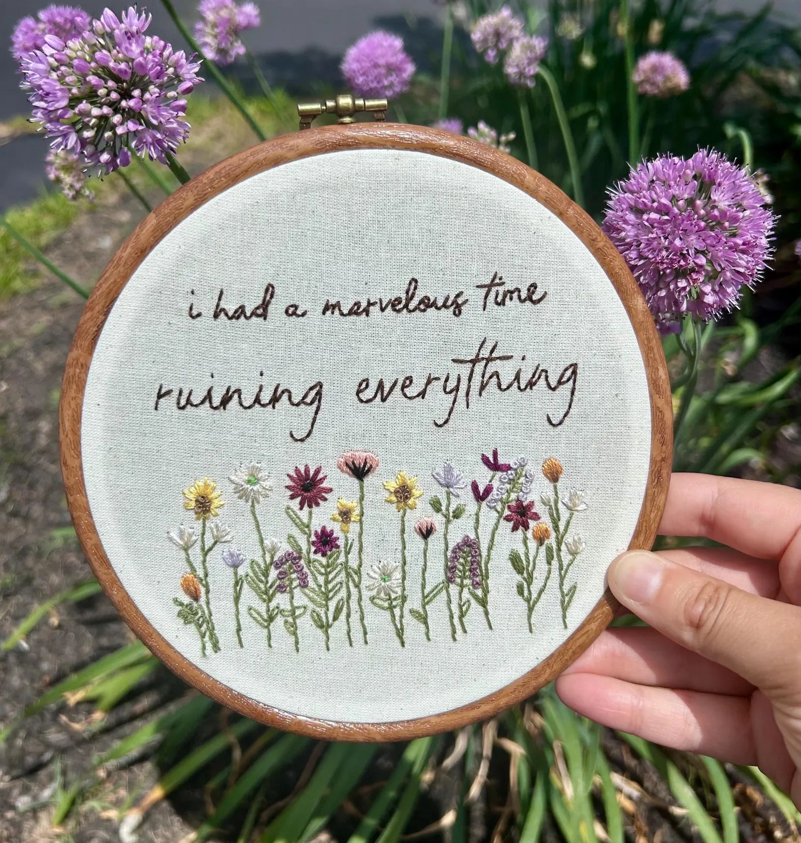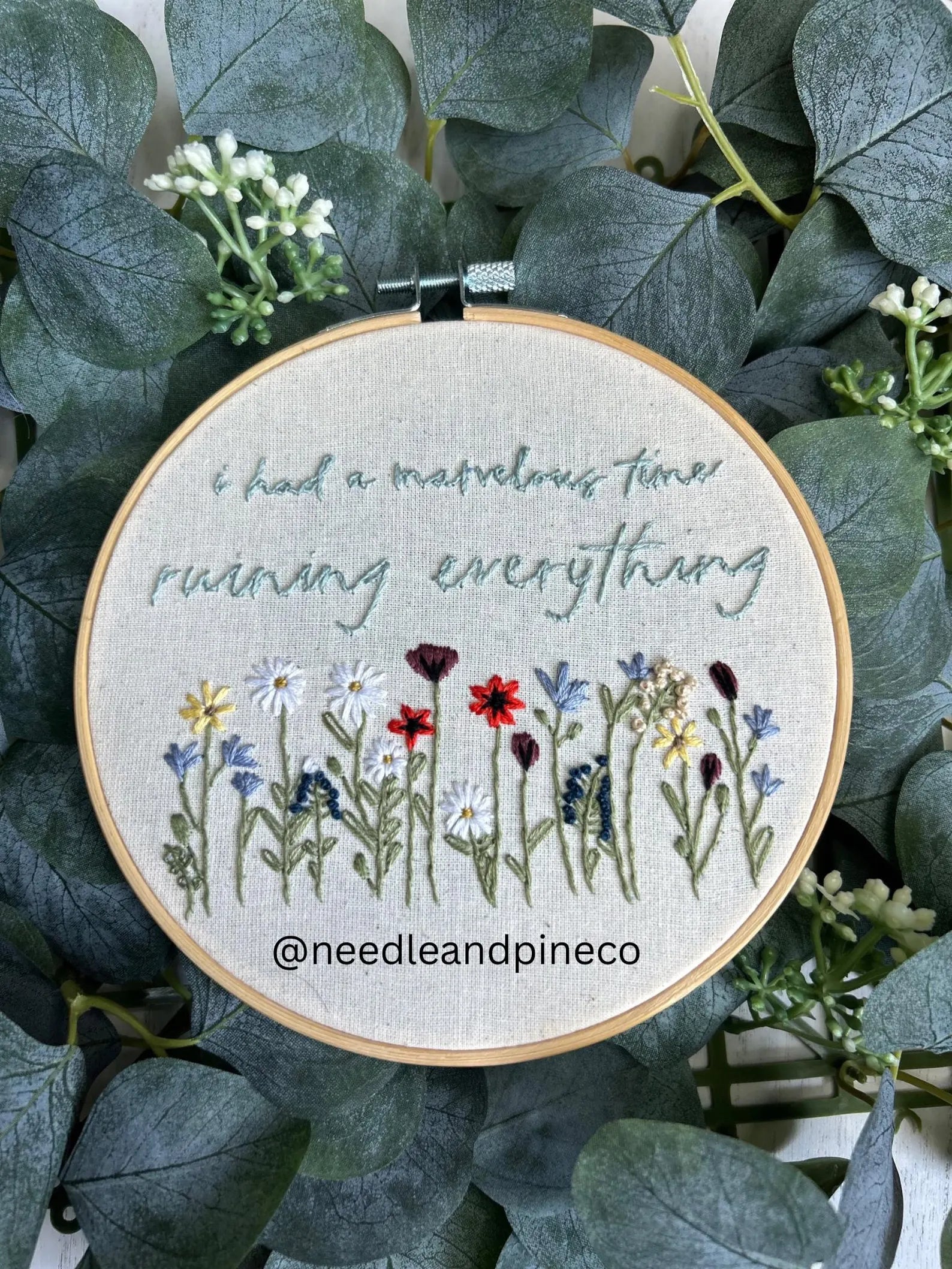 Hand embroidered finished 6” hoop. Design includes wildflowers and a lyric from “Last Great American Dynasty”