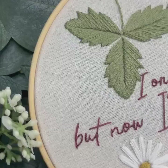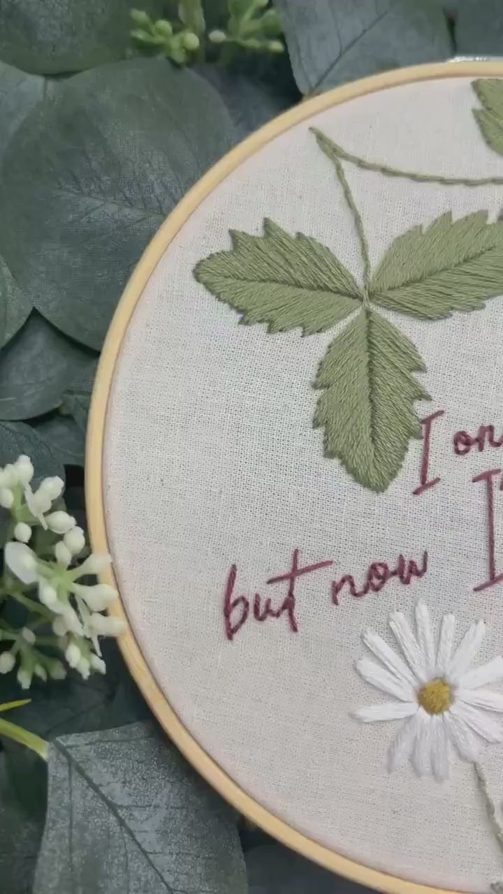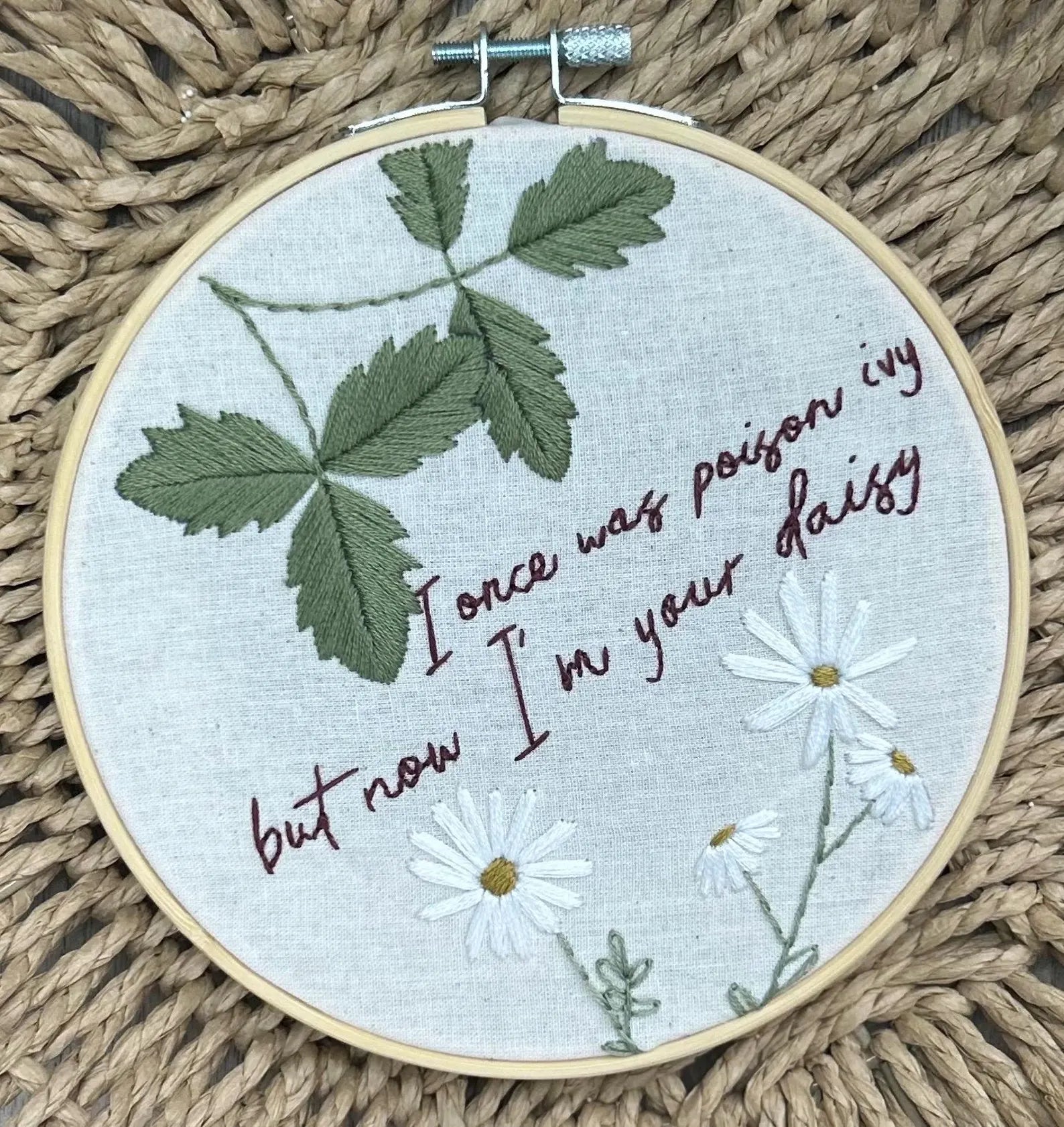Hand embroidered finished 6” hoop. Design includes a lyric from “Don’t Blame Me”