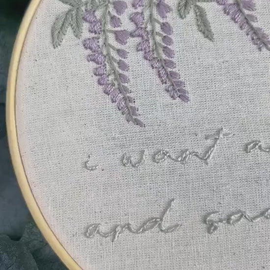 Hand embroidered finished 6” hoop. Design includes wisteria and a lyric from “The Lakes”